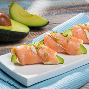 رول ســلمون الفاخر المدخن المحشو بقطع افوكادو والجبنة الـبـيـضــاء الخـفـيـفـة مــع اعشــاب وتشكـيـلـة مـن أوراق الخس مع صلصة الأنشوفي