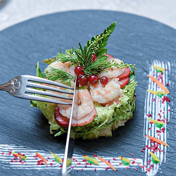marinated Shrimps with herbs oil , pineapple and strawberry with crunchy chiso salad Leaves with passion dressing