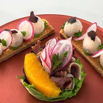Sliced smoked Duck breast , Chicken coconut tossed on crispy layer with orange and fig dressing salad